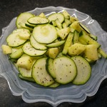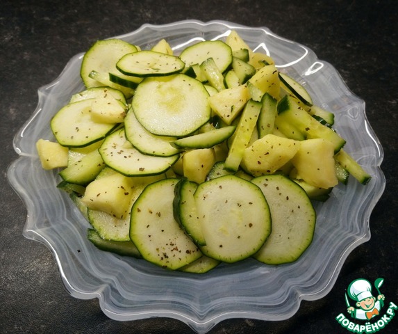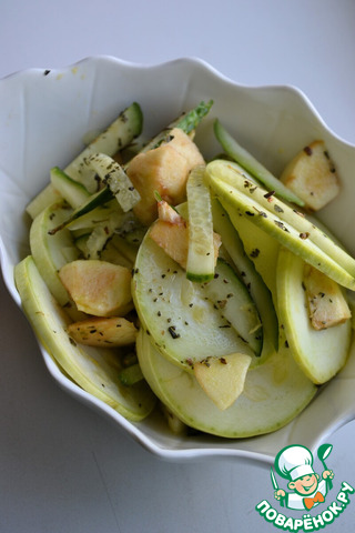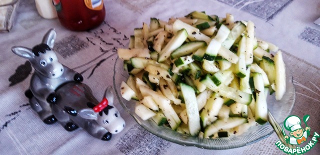 Яблоко очищаем и нарезаем ломтиками.Огурец нарезаем соломкой, кабачок - кружочками