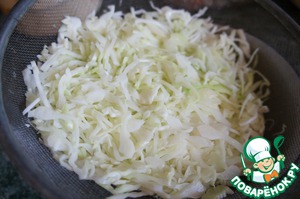 Выложить капусту в дуршлаг, обдать крутым кипятком и затем холодной водой, дать ей стечь.