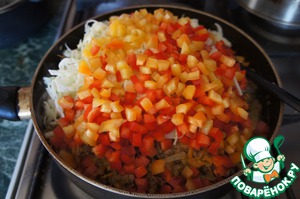 Затем положить капусту и перец, посолить, поперчить и потушить еще 10 минут.