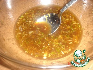 Из имбиря, чеснока, сока и цедры лайма, меда и соевого соуса готовим маринад.
