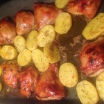 Укладываем бедрышки в посуду, в которой они будут запекаться, заливаем маринадом (я его и под шкурку залила - заложила).