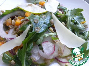 • Смешиваем все ингредиенты с чечевицей, салатом (у меня руккола), добавляем орехи, изюм, заправляем (оливковое масло+лимонный сок+соль+перец),