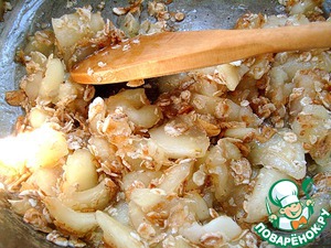 Половину сахара и половину сливочного масла разогреваем и немного провариваем на сковороде, кладем туда же наши яблочки, слегка притушиваем. Добавляем наши поджаренные хлопья - это будет начинка) -