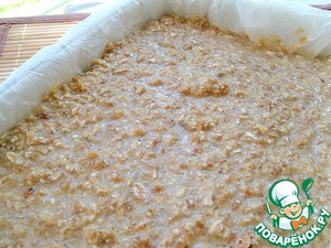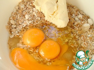Тесто готовится шикарно: в блендер кладем оставшиеся хлопья, масло, сахар, яйца, ванилин и разрыхлитель. Все это смешиваем до однородности.