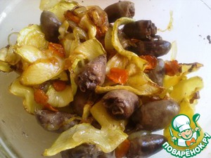 Добавляем к промаринованному цуккини морковь с луком и сердечки куриные.