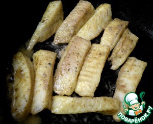Рыбу обваливаем в муке и жарим на растительном масле на среднем огне до румяной корочки