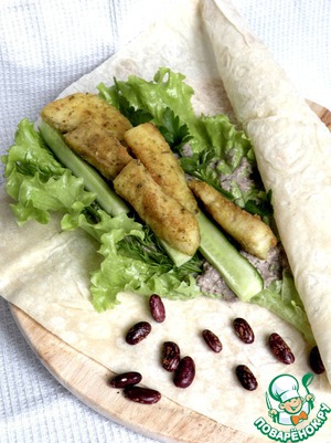 Каждый лист лаваша разрезаем надвое, выкладываем на него листик салата, пару ложек фасолевой массы (не жалеем), зелень, огурчик режем брусочками каждый на 6 частей, по три ломтика выкладываем на паштет. Добавляем рыбку, заворачиваем конвертом так, чтобы одна сторона была открыта (но это на любителя)