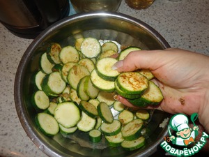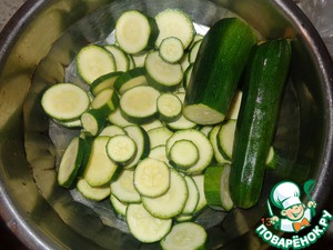 Молоденькие кабачки моем, отрезаем плодоножку, я даже не стала срезать шкурку, потому что она совсем тонюсенькая. Режем тонкими пластинками.