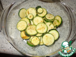 Фарш солим, перчим, добавляем специи, перемешиваем. Выкладываем первым слоем половину нарезанных зародышей кабачков.