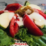 Выкладываем томаты и яблоки на листья салата на порционные тарелки, заправляем, присыпаем (по вкусу) семенами горчицы и розовым перцем (Ириша-Ируня, огромный привет!!!)