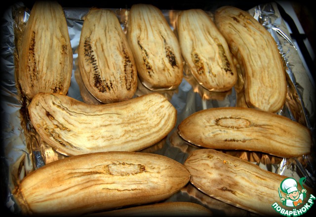 Очистить овощечисткой баклажаны, разрезать пополам и также уложить на противень, запечь при той же температуре, переворачивать не надо, печь до мягкого состояния, я проверяю вилкой.