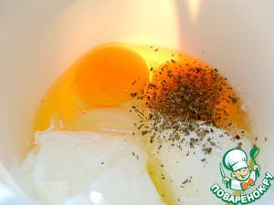 Пока наши овощи и мясо запекаются, мы готовим заливку: взбиваем сметану, яйца, рикотту и специи. Добавляем оставшийся после протушивания мяса и овощей бульон.