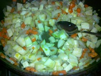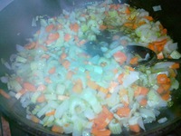 Нарезаем мелко лук, сельдерей, морковь и чеснок, ставим сковороду на плиту, вливаем масло и обжариваем слегка. |