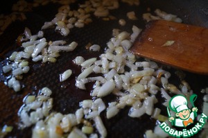 Лук обжарить до прозрачности на разогретом масле, всё время мешая, он не должен зажариться.