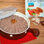 • В глубокую миску выкладываем остывшую фасоль (без отвара, отвар не выливать!), масло, хмели-сунели, чеснок и измельченные орехи.