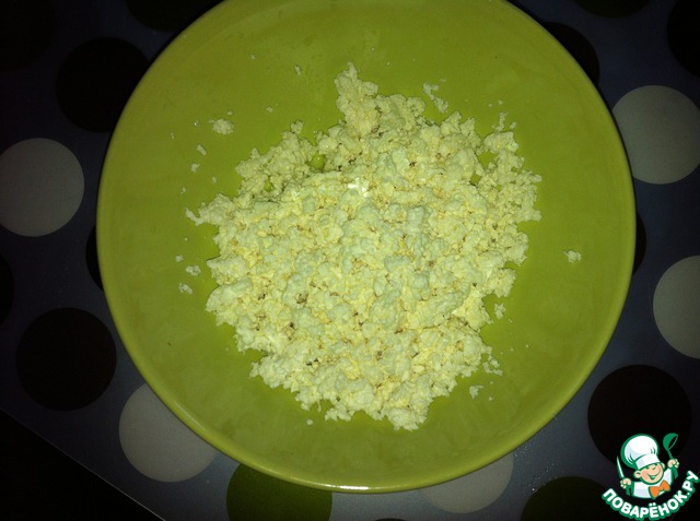 Сыворотку слейте через марлю (её можно потом использовать на блины или оладьи), творогу дайте немного постоять. Можно выжать всю сыворотку, завернув марлю в мешочек, но тогда творог будет очень сухим.