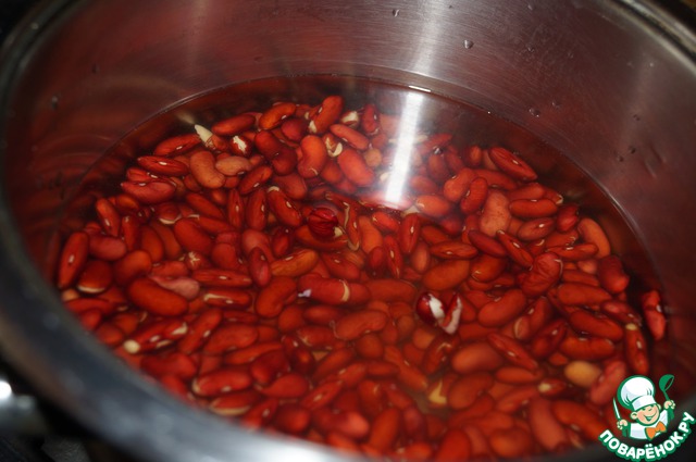 Замочить фасоль на ночь. Потом поменять воду на свежую и поставить варить до готовности около 1.5 часов.