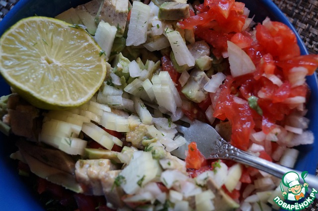 Помидоры и авокадо нарежем мелкими кубиками, добавим лук, зелень, посолим и поперчим, добавим сок лайма и, разминая вилкой, превратим в пёструю пасту.