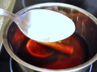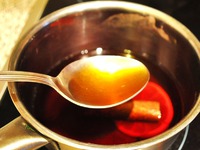 В кастрюльку нальем вино, чай, специи, лимон и сахар, поставим на огонь и будем подогревать.