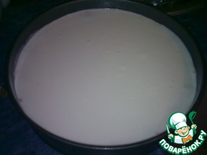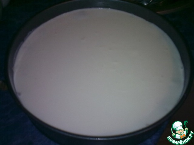 Достаем из холодильника форму с первым слоем и выкладываем второй крем наверх. Снова ставим в холодильник на 30 мин. для застывания.