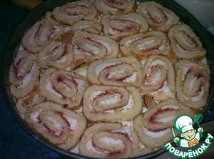 Через 30 мин. режем еще 2 рулета, укладываем их в форму вот так.