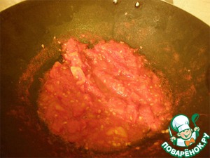 Помидоры потереть на терке и тушить на медленном огне 15 минут с добавлением 1/2 чайной ложки сахара, 1/2 чайной ложки соли и 1 столовой ложки уксуса.
