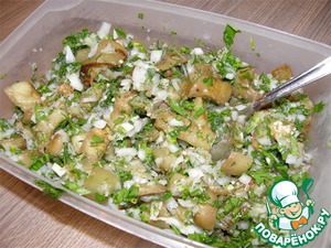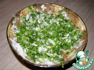 Лук и зелень мелко порезать, выдавить чеснок, перемешать.