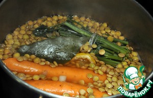 Отвариваем её вместе с долькой лимона, соком (добавленным в воду) из половинки лимона, лаврушкой и пучком петрушки,