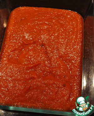 В посуду для выпечки наливаем томатный соус (соус готовите так, как любите, можно использовать просто кетчуп или томатную пасту, перемешанную с сыром, чесноком и специями по вашему вкусу)