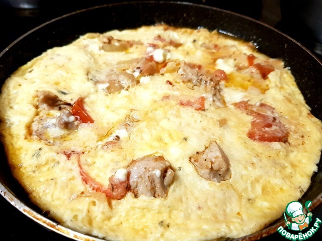 Яйца взбить, немного посолить и поперчить. Влить в курицу. Накрыть крышкой и довести до готовности (яйца должны быть готовы, а соус от помидор, лука и куриного бульона должен остаться).