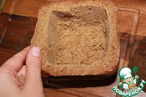 С хлебных буханок срезать верхушки, из серединок вынуть мякиш, оставив достаточно толстые стенки.