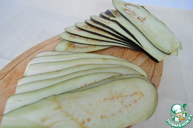Баклажаны порежем на тонкие ломтики.