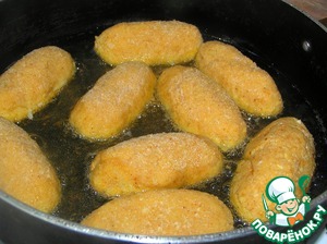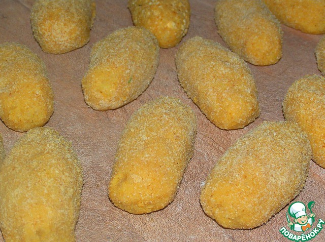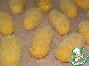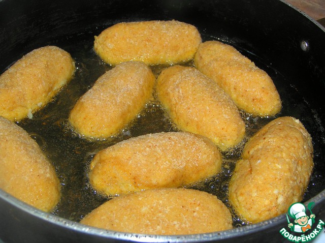 Из фарша сформировать палочки. Обвалять в панировочных сухарях.