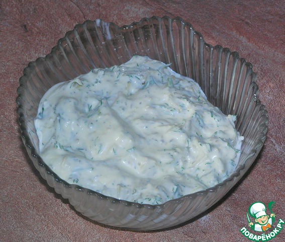 Соус: Корнишоны и чеснок потереть на мелкой терке. Добавить сметану, майонез, мелко нарезанный укроп. Тщательно перемешать.