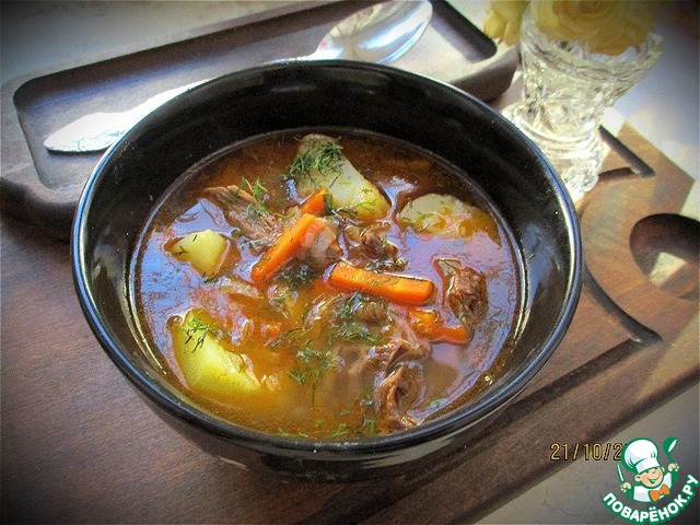 Острый суп на говядине. Приготовлено по рецепту из «Книга о вкусной и здоровой пище».