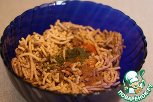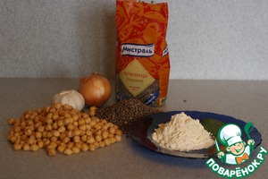 • Лук и чеснок очистить. Пропустить через мясорубку вместе с нутом и чечевицей. В "фарш" добавить специи.