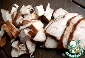 Куриную грудку, бекон достаем шумовкой из бульона, нарезаем как нравится.