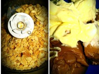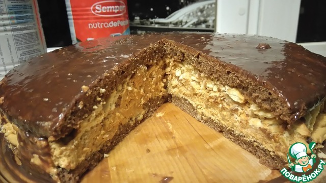 Крем: 1 банка вареной сгущенки + 200 г слив. масла комнатной температуры---взбить. Добавить чуть больше половины измельченного арахиса. |