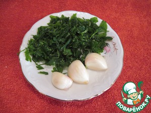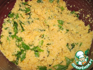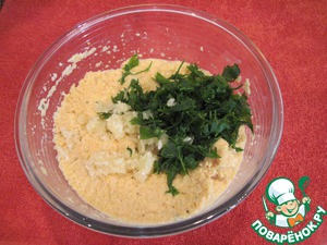 К муке добавить соль, перец. Влить медленно воду, аккуратно размешивая массу. Добавить измельченные петрушку и чеснок.