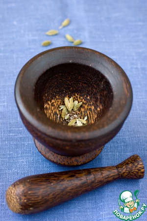 Коробочки кардамона раздавить плоской стороной ножа или в ступке