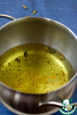 Вскипятить воду, добавить кардамон. У меня была сухая апельсиновая цедра, поэтому я положила ее вместе с кардамоном, если у вас цедра свежая, то закладывать ее нужно потом, вместе с чаем. Прогреть смесь на слабом огне 10 минут