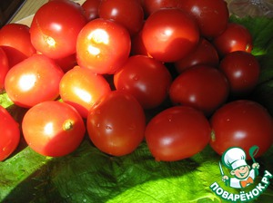 Беру мелкие помидоры, здесь у меня сорт "сливка", виноградные листья, тщательно мою холодной водой.