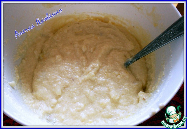 Добавьте манную кашу и перемешайте до однородности, у меня ложкой перемешать до однородного состояния так и не получилось, может, потому, что каша густая была, я обратилась за помощью к миксеру, он справился с задачей в секунду :)