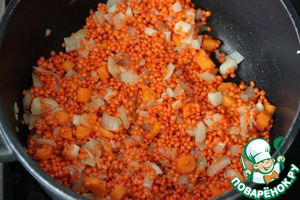 Добавить красную чечевицу и прожарить всё вместе, пока чечевица не впитает масло.