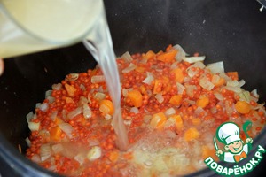 Добавить бульон небольшими порциями и тушить всё вместе на среднем огне 10-12 мин.