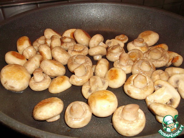 Шампиньоны помыть, если на ножках осталась земля - срезать. Растительное масло нагреть в сковороде и обжарить ( спассировать) шампиньоны, 5-8 минут. Посолить. Снять с огня. |