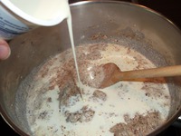 150 г сыра трём на тёрке и добавляем в соус. Заправляем солью, перцем и мускатным орехом. |