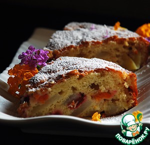перемешать фрукты с тестом, выложить все это в смазанную форму (24 см диаметром) и выпекать в духовке 30-35 минут до готовности, готовность проверяйте деревянной зубочисткой :) Посыпать пирог сахарной пудрой (по желанию) :) Приятного аппетита!!!