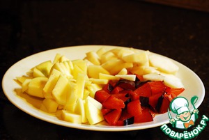порезать яблоко и грушу тонкими пластинами, а сливу - кубиками...