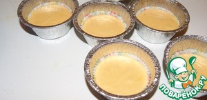 Заполнить формочки, в которые вложить, если есть, гофрированные манжеты, если нет - то застелить дно пекарской бумагой и смазать маслом, заполнить тестом до половины.